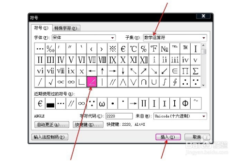 在“子集”中选择“数学运算符”,鄙人方选中角度符号,点击“插入”。