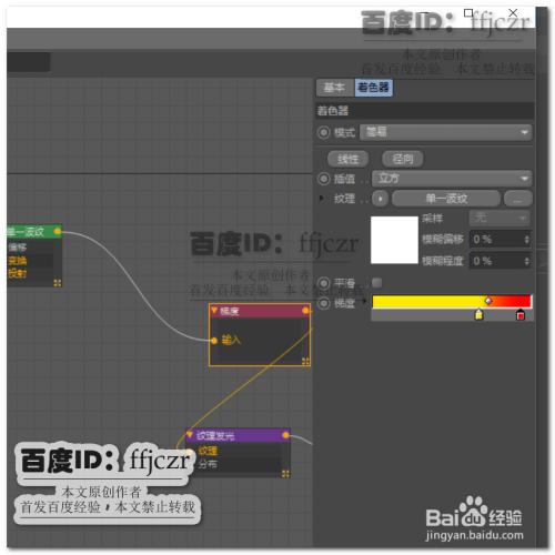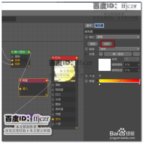 在渐变着色器中,选择渐变体例为径标的目的;在主动添加的单一波纹节点中,选择类型为三角波纹,