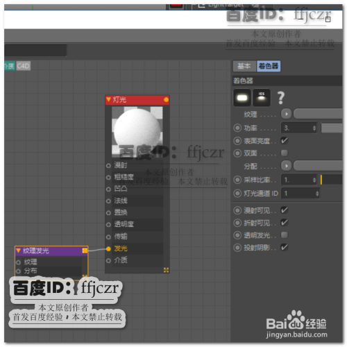 添加一个漫射类型的材质,更名为灯光付与灯管。在节点编纂器中,添加纹剃头光节点,此时的灯管发出了刺眼的强光;添加一个渐叛变点到纹剃头光节上,用来节制光的生当作结果。