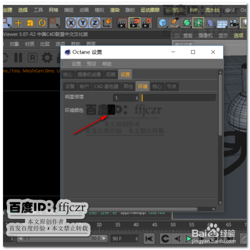 要想衬着出发光的结果,场景中当然如果黑色的才行。这里可以点开OC衬着器中的设置,选择情况选项,将情况颜色改为黑色即可。