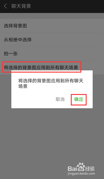选择最下方的 将选择的布景图应用到所有聊天场景,在呈现的对话框中,选择确定后,设置完当作。