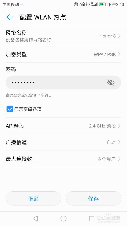 打开设置装备摆设WLAN热点可以看到收集名称,加密类型,我们就可以改变设备名称,设置好密码,其他人就可以经由过程WiFi找到我们的热点,然后输入密码就可以上网了。