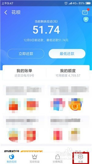 接下来需要在花呗功能中点击右下角的【设置】选项。