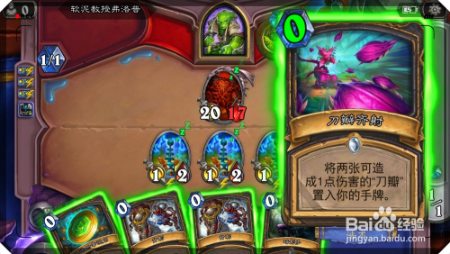 第二步,接着继续上0费的刀瓣齐射,获取两张新牌,同样再次激发场中绕圈的3次-1伤进犯。