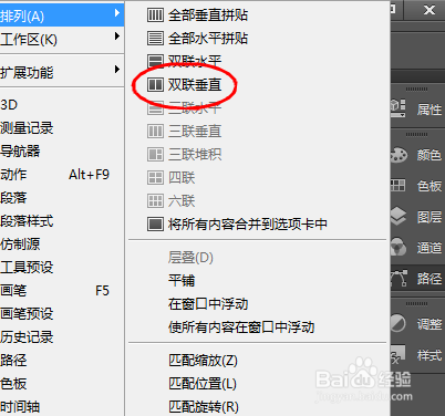 新建一个500×500像素的,布景为透明色的空白文件,点击窗口---摆列---并联摆列,将两个图形,并列
