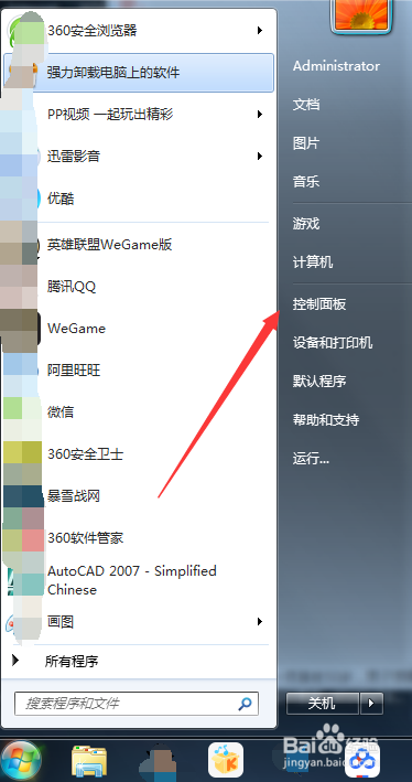 首先我们点击桌面左下角的“起头”菜单,找到并点击“节制面板”选项,如图所示;