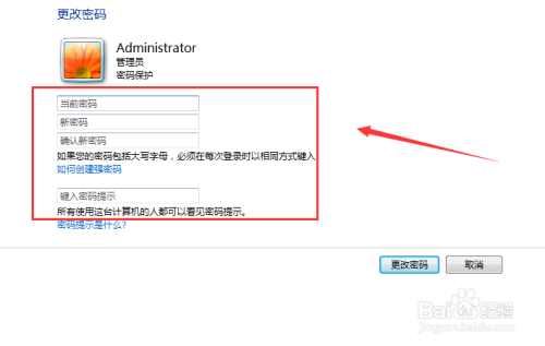 若是我们要点窜密码的话仍是进入到用户账户,然后点击更改密码 ,先输入准确的旧的密码再设置新密码即可,如图所示。