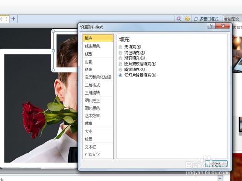 选择小矩形,右键单击选择设置外形格局,勾选设置幻灯片填充选项。