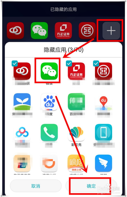 这时,你只需点击埋没页面中的“+”号按钮,在弹出的新页面中,打消“微信”图标上的勾,点击“确定”保留,即可恢复桌面微信图标。