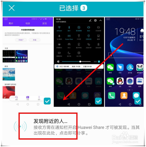 这时,若是没有发现有开启“Huawei Share”手机时,界面会如图1所示(“发现四周的人…”),而若是发现有开启该功能的手机,界面如图2所示。