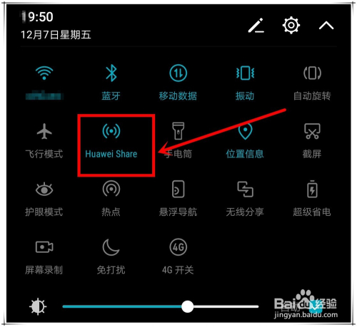 然后,别离在两台手机上,从状况栏标的目的下滑出通知面板,点亮“Huawei Share”图示。