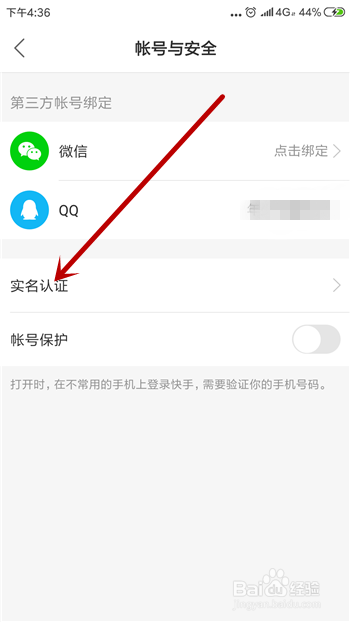 在账号与平安界面后就可以看到【实名认证】了,点击起头实名认证。