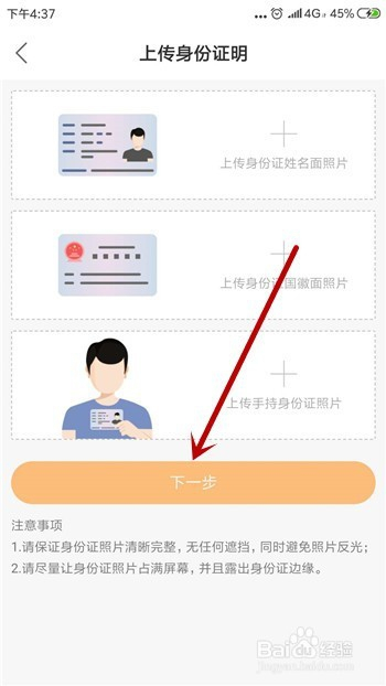 接下来就可以上传我们的身份证照片了,此外还需要手持身份证照片,然后点击【下一步】按要求即可完当作实名认证。