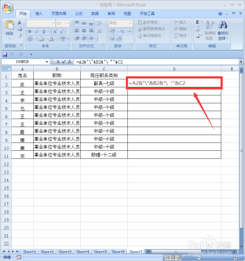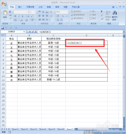 选中D2单位格,在此中输入“=A2&B2&C2”输入完毕,按回车