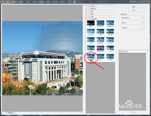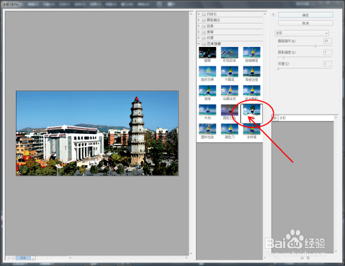 鼠标点击选中图片,点击【结果】-【艺术结果】-【水彩】,按图示对图片的画笔细节、暗影强度、纹理参数进行设置(如图所示)。