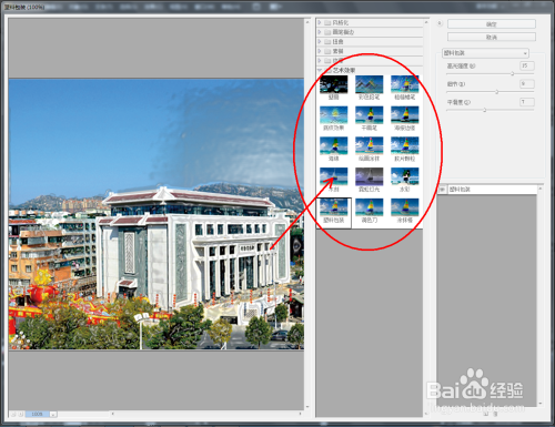 鼠标点击选中图片,点击【结果】-【艺术结果】-【塑料包装】,按图示对图片的高光强度、细节、光滑度参数进行设置(如图所示);