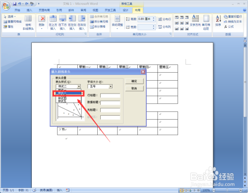在对话框“插入斜线表头”中的“表头式样”中,单击下拉箭头,选择“式样二”