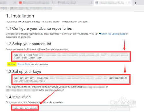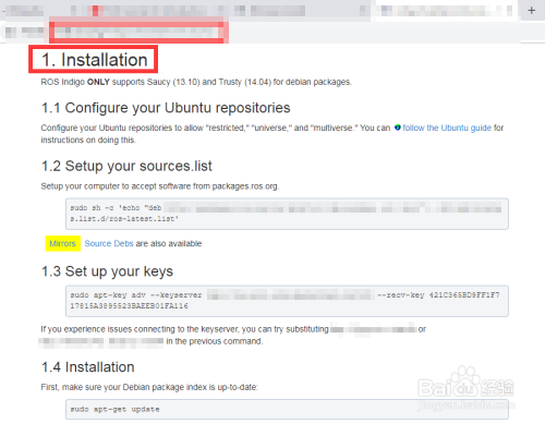 浏览器跳转至新的页面,可以看到有4个选项,对应4个分歧的机械人操作系统,我们选择第一个Get ROS Indigo Igloo on Ubuntu Linux,点击Install。浏览器跳转至新的页面,下拉至1. Installation。