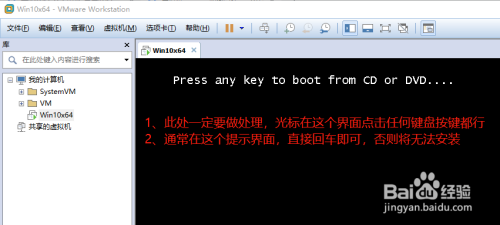 虚拟机中起头安装win10的时辰,呈现界面【Press any key to boot from CD or DVD ...】,此时必然要将光标至于虚拟机中,然后按任何一个按键,凡是按回车即可。