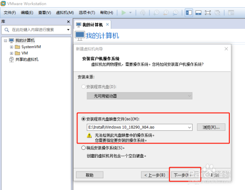 选择【安装法式光盘映像文件(iso)】,并点击【浏览】按钮,选择win10的iso安装文件,若是提醒“无法检测此光盘映像中的操作系统”,可以忽略这个提醒,只要您的安装文件是正常的,直接点击【下一步】按钮