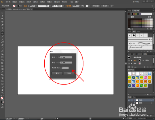 点击【星型东西】,将菜单栏上方的画笔参数按图示设置好后,鼠标点击作图区域,弹出星形东西设置框,将半径1设置为50,半径2设置为20,角点数设置为5,点击【确定】绘制出五角星图案。按同样的步调绘制出别的两个分歧颜色和角点数的图案(如图所示);