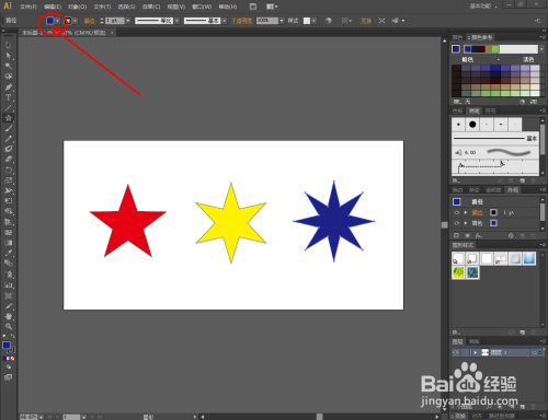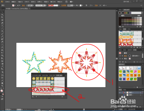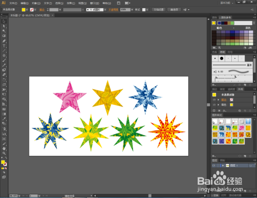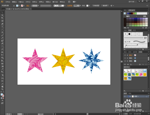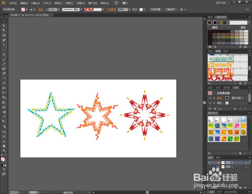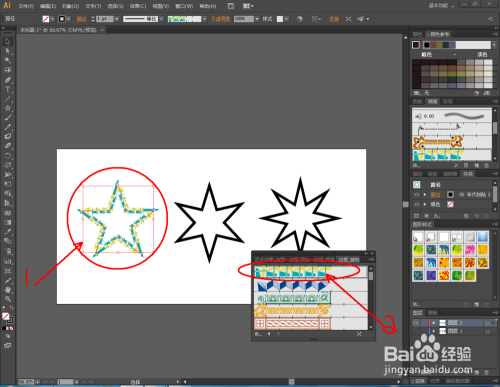 点击右边工作区中【画笔库菜单】-【边框】-【边框-装饰】弹出边框样式选项栏。别离选中三个星形边框图案,给它们添加分歧的边框结果(如图所示)完当作对星形图案的建造。