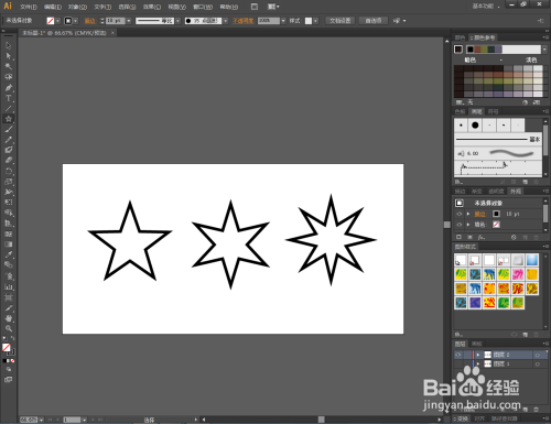 按图示设置佳肴单栏上方的画笔参数,点击【星形东西】,在作图区域绘制出三个分歧角点数的星形边框图案(如图所示);