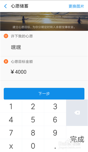 改换完图片之后,【许下我的心愿】下面写上本身喜好的代称,好比“嘿嘿”,然后输入【心愿方针金额】,点击【下一步】