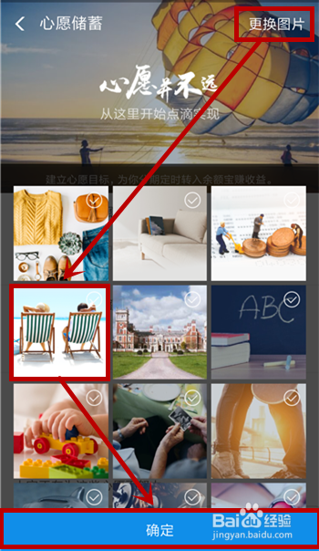 在打开的【心愿储蓄】界面,我们点击右上角的【改换图片】,可以选择一张本身喜好的图片
