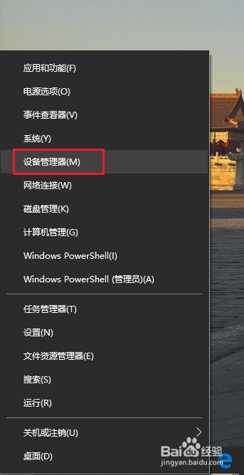 鼠标右键单击桌面左下角的 Windows 徽标,然后在弹出的窗口里面选择设备办理器。