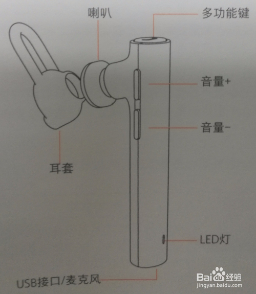 首先,我们来熟悉下小米蓝牙耳机的布局,耳机由耳套、喇叭、多功能按键、音量键、指示灯、USB接口/麦克风等几个部门构成,这个布局所处位置如下图所示。