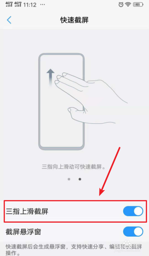 进入后,页面上方会显示出三指截屏的操作动画。我们将三指上滑截屏的选项打开。打开后在手机页面从底部三指上滑就可以完当作截屏。