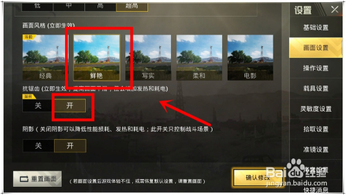 设置画面更清楚第五步:画面气概选择鲜艳气概会让画面更清楚,但看久了会毁伤眼睛。抗锯齿打开后,可提高画面的光滑度。