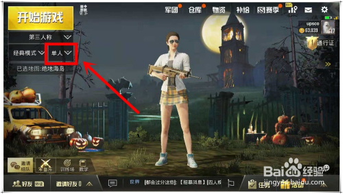 介入单人四排第三步:进入游戏年夜厅后,在游戏界面的左上角,找到“起头游戏”按钮的下方第二排后面的下拉选项。