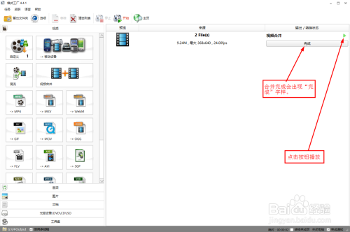 如下图所示,当归并进度条呈现“完当作”字样时,就标记视频归并完当作。点击右上角的三角形按钮,可以进行归并后的视频预览。点击后会跳出视频播放窗口。如许整个视频归并就做完了。