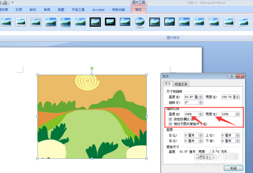 设置缩放比例:在缩放比例项目中,将高度、宽度均设置为100%即为原始尺寸,当然也可按照自我需求进行恰当缩放(对于尺寸年夜的图片,插入word后一般城市主动压缩)