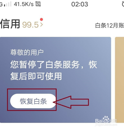 点击“白条”,进入到白条的信用窗口页面,在页面的左上角我们可以看到“恢复白条”。