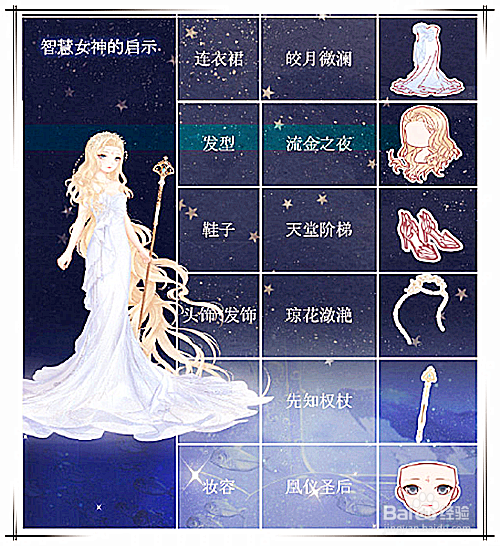 发型保举选择流金之夜;然后利用琼花潋滟做为头饰*发饰;妆容方面,利用凤仪圣后;衣服选择皎月微澜连衣裙;手持先知权杖;脚穿天堂阶梯鞋子。