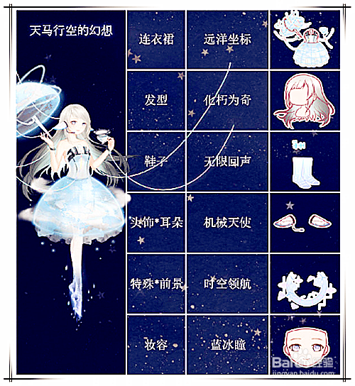 选择化朽为奇做为发型的样式;头戴机械天使头饰;化蓝冰瞳的妆容;着远洋坐标连衣裙;穿无限反响鞋子;利用时空领航特别*前景。