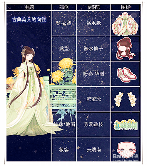 连衣裙利用落水歌条目;鞋子选择盼春;头发利用湘水仙子发型;头饰拔取流萤念;妆容利用云端南的;利用芳蕊盈枝装饰地面。