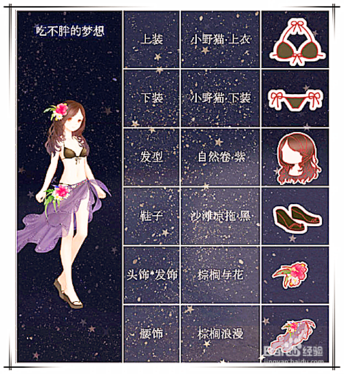 发型可以利用天然卷*紫;头饰*发饰项,保举选择棕榈与花;上装这里保举拔取小野猫上衣;利用棕榈浪漫做为腰饰;下装为小野猫下装;鞋子采用沙岸凉拖*黑即可。