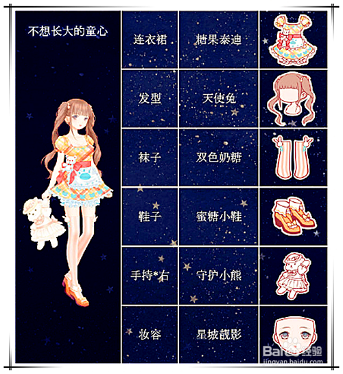 连衣裙保举选择“糖果泰迪”;发型保举选择“天使兔”;袜子可以选择“双色奶糖”系列;鞋子保举利用蜜糖小鞋;妆容保举利用星城靓影;手持*右保举拔取守护小熊。