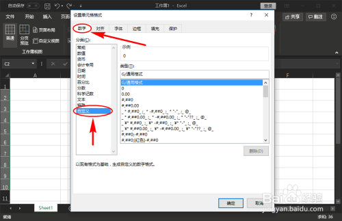 打开“设置单位格格局”弹窗之后,我们在弹窗里面选择“数字”栏目组,然后在左侧菜单中选择“自界说”菜单设置项。