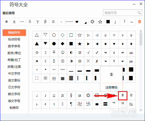 打开“符号”弹窗之后,我们在顶部导航菜单中直接选择“特别字符”栏目,再在里面找到注册商标标记。
