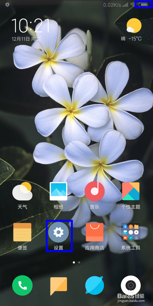 首先,我们打开手机首页,我们可以看到手机右上角电池是以图形体例显示的,下面我们就来换当作百分比的,找到设置,点击进去。