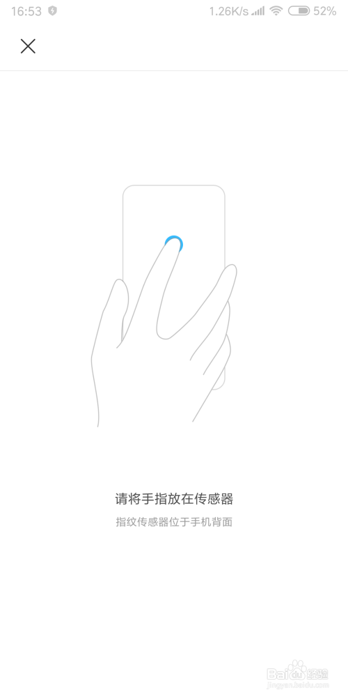 进去输入密码,进入指纹密码设置,这是需要你将手指放到手机背部指纹传感器上。