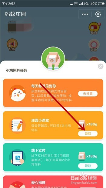 接着返回领饲料使命后点击庄园小讲堂里的【领取】可获得饲料。