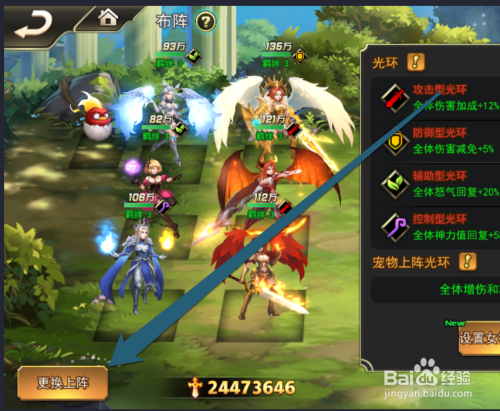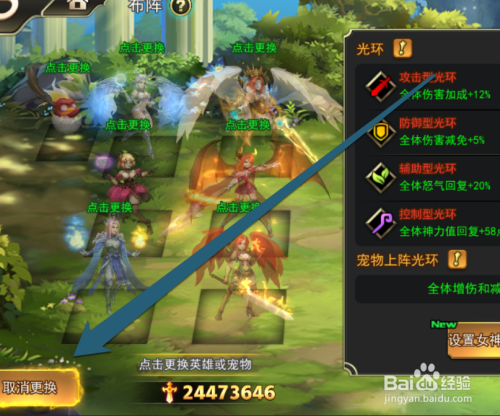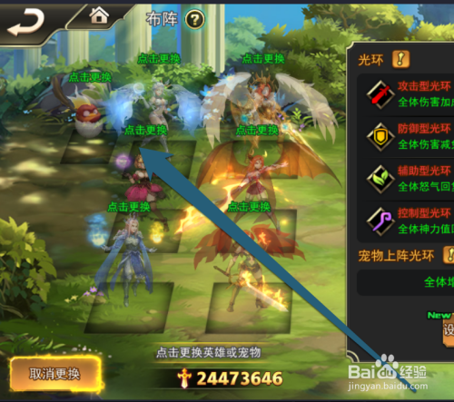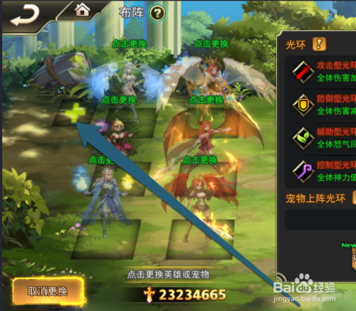 点击布阵按钮今后,进入布阵的界面,点击改换英雄的按钮。