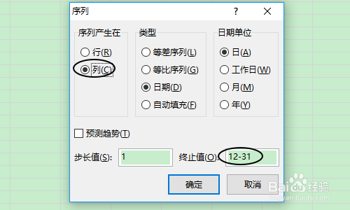 我们需要勾选对话框中的“列”,然后在终止值中输入本身指定的终止日期,好比12月31日,点击确定返回到表格,我们会发现这一列已经批量填充了对应的日期,见图二;