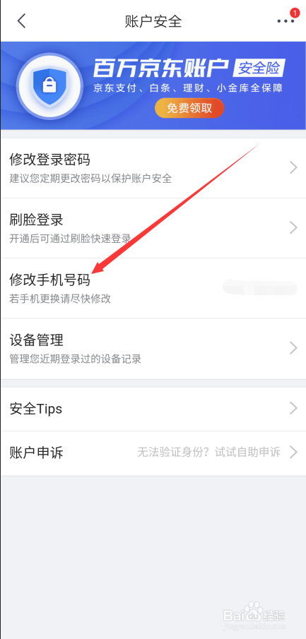在京东账户平安界面直接点击【点窜手机号码】,如下图实施。